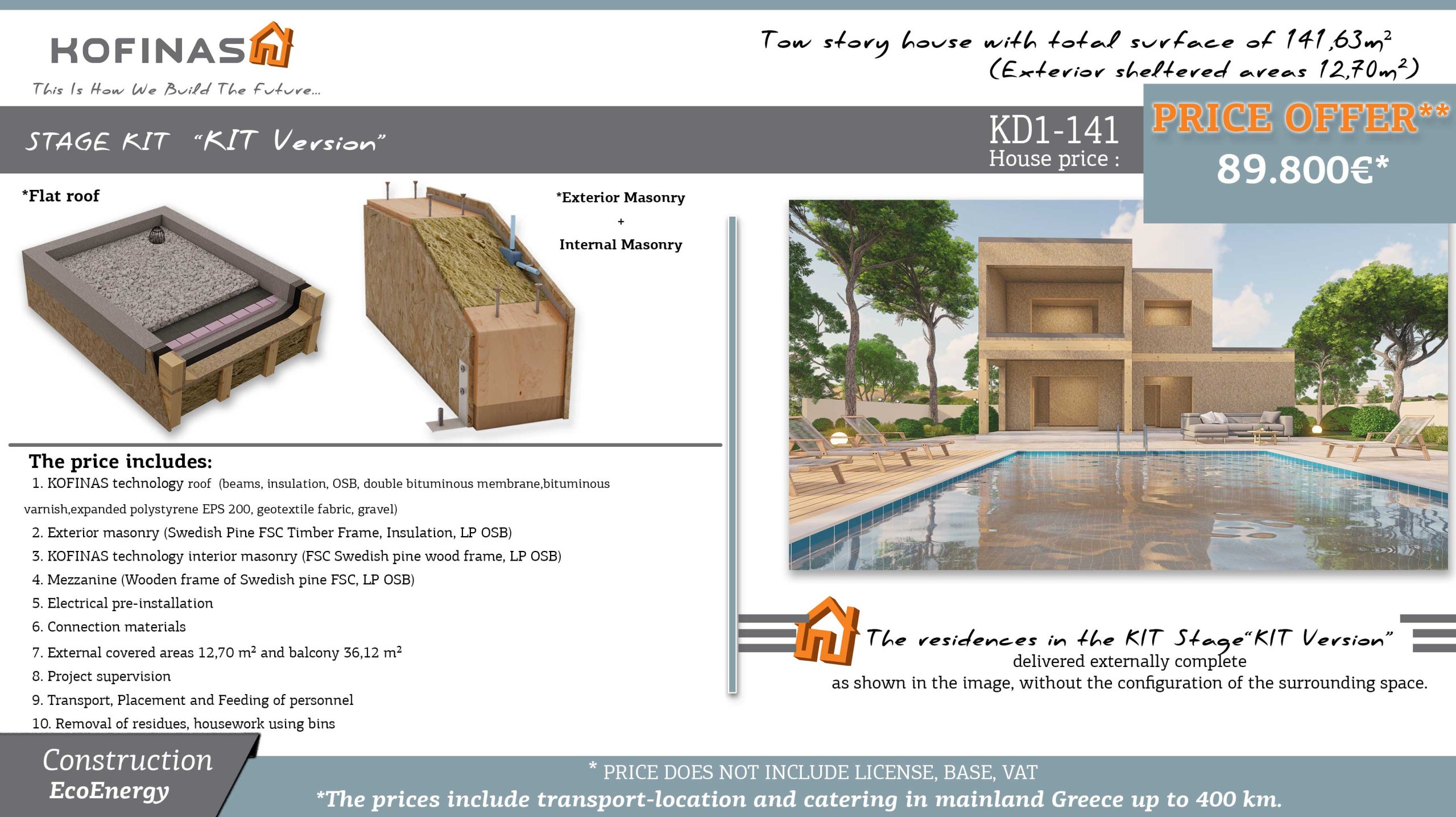 - Покрив (тераса) по технологията на Kofinas (греди, изолация, OSB, двоен асфалтов лист, асфалтов лак, полистирол ESP200, геотекстил, чакъл)