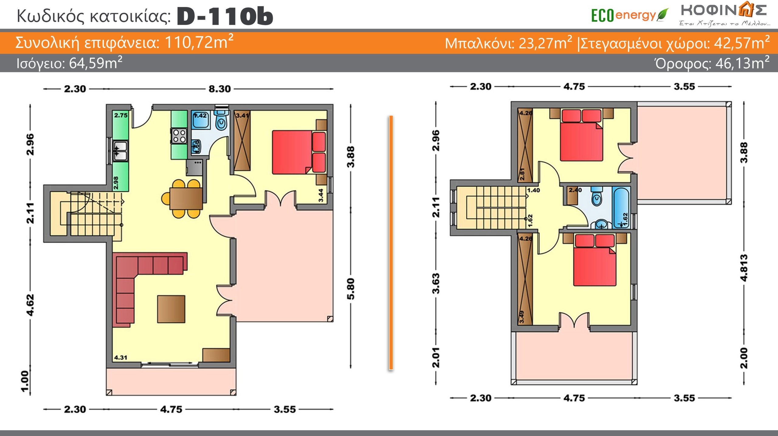 Das Unternehmen KOFINAS SA präsentiert Ihnen einen 110,72 m² großen Duplexhausvorschlag (Duplex D-110b) für Ihr Traumhaus. Das Unternehmen Kofinas ist innovativ, ohne sich auszuruhen. Ständig eintreten neue Elemente beim Hausbau. Welche sind anerkannt und „sind zertifiziert". Sowohl von unseren Hunderten zufriedener Kunden als auch von der Nationalen Technischen Universität Athen. In dem das einzigartige Bausystem der Firma Kofinas auf seine Dauerhaftigkeit getestet wurde Überwindung jeder natürlichen Grenze der Ausdauer. Das zweistöckige Haus D-110b mit der Nutzung Schwedisches Holz Als Hauptbaustoff macht es die Residenz aus absolut ökologisch. Denn beim Bau von Häusern reduziert der Ersatz herkömmlicher Baustoffe durch Holz um 1,1 Tonnen pro Kubikmeter den Ausstoß von Kohlendioxid in die Atmosphäre. Vor allem, wenn das Unternehmen mit schwedischen und finnischen Sägewerken zusammenarbeitet, wo für jeden gefällten Baum drei bis fünf neue gepflanzt werden, was im Wesentlichen produziert negativen CO2-Fußabdruck.