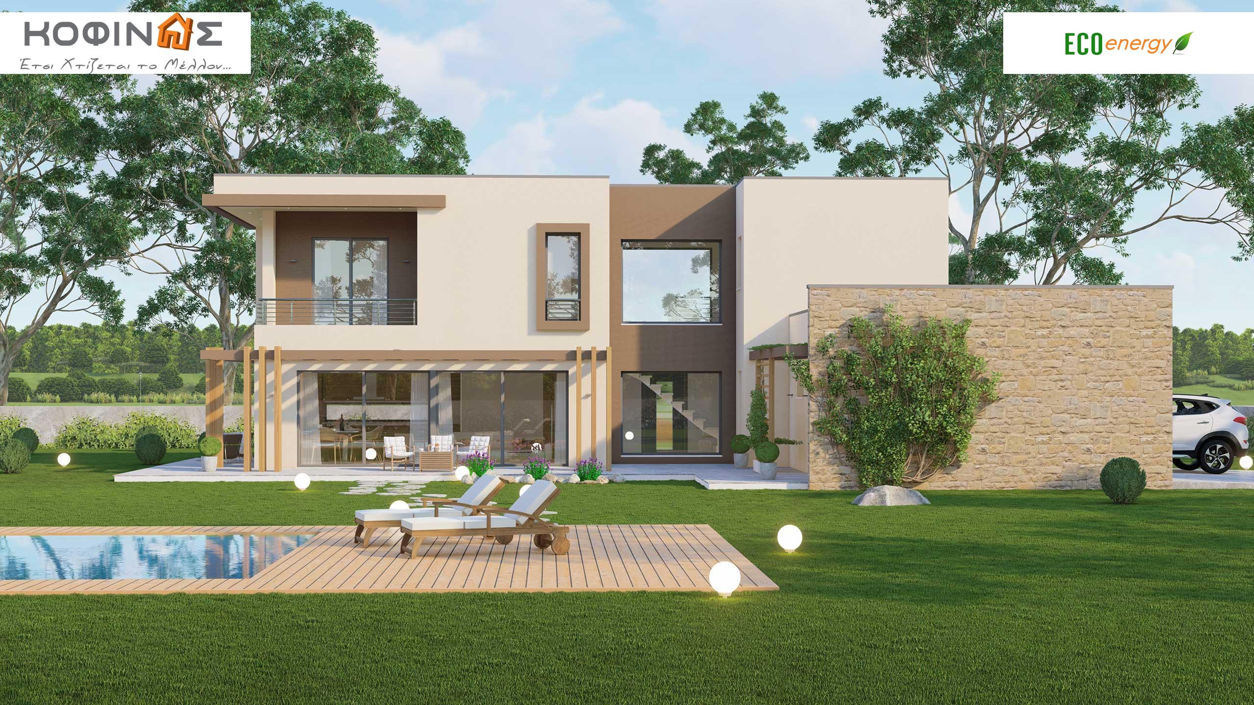 The company KOFINAS SA presents you with a proposal for a two-story house of 163.58 m² (Two-story house D-163) for the home of your dreams. The company Kofinas innovates without resting. It constantly introduces new elements in the construction of houses. Which are also recognized as “are certified". Both from our hundreds of satisfied customers and from the National Technical University of Athens. In which the unique building system of the Kofinas company was tested for its durability surpassing every natural limit of endurance. The two-story house D-163 with the use Swedish timber as the main building material, makes the residence completely ecological. Since in the construction of houses, replacing conventional building materials with wood reduces carbon dioxide emissions into the atmosphere by 1.1 tons per cubic meter. Especially when the company collaborates with Swedish and Finnish timber production plants, where for every tree that is cut down, three to five new ones are planted, essentially producing negative carbon footprint.