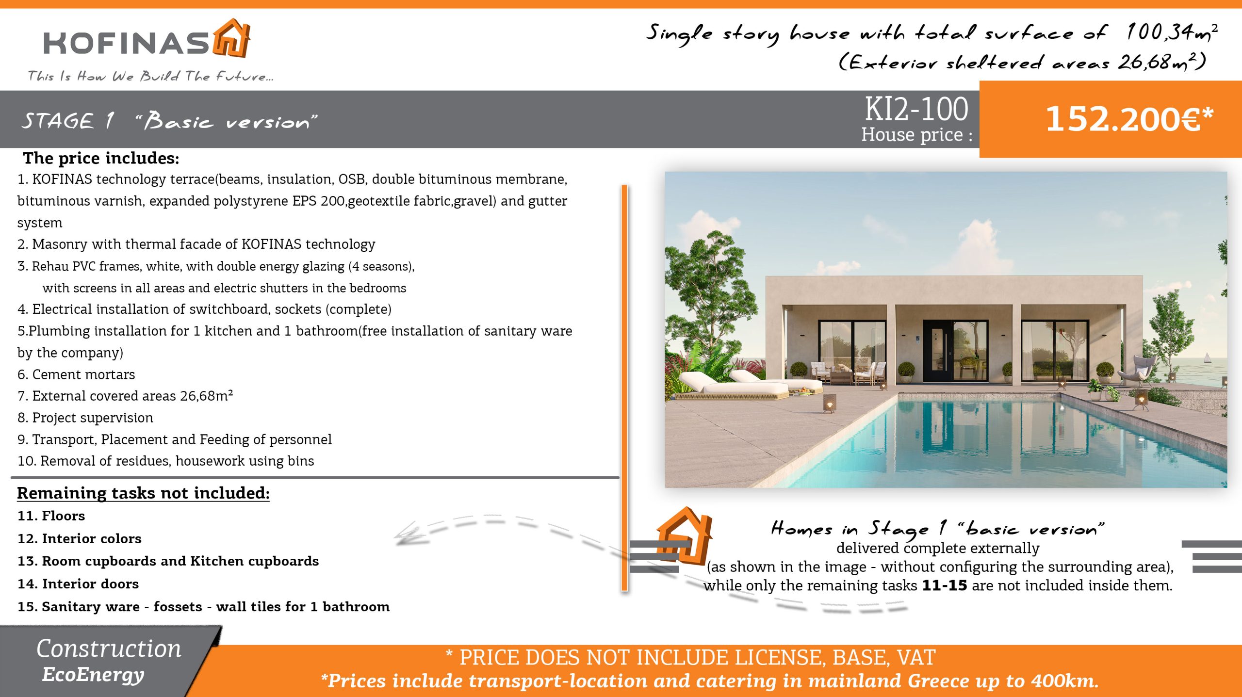 OR KOFINAS S.A. presents the new indicative costed plan Ground Floor Residence KI2-100 (100.34 sq.m.), a comprehensive proposal of high aesthetics and functionality, combining innovation with ecological awareness. Designed to meet every need of the modern family, the KI2-100 residence reflects the company's values: quality, sustainability and long-term guarantee.