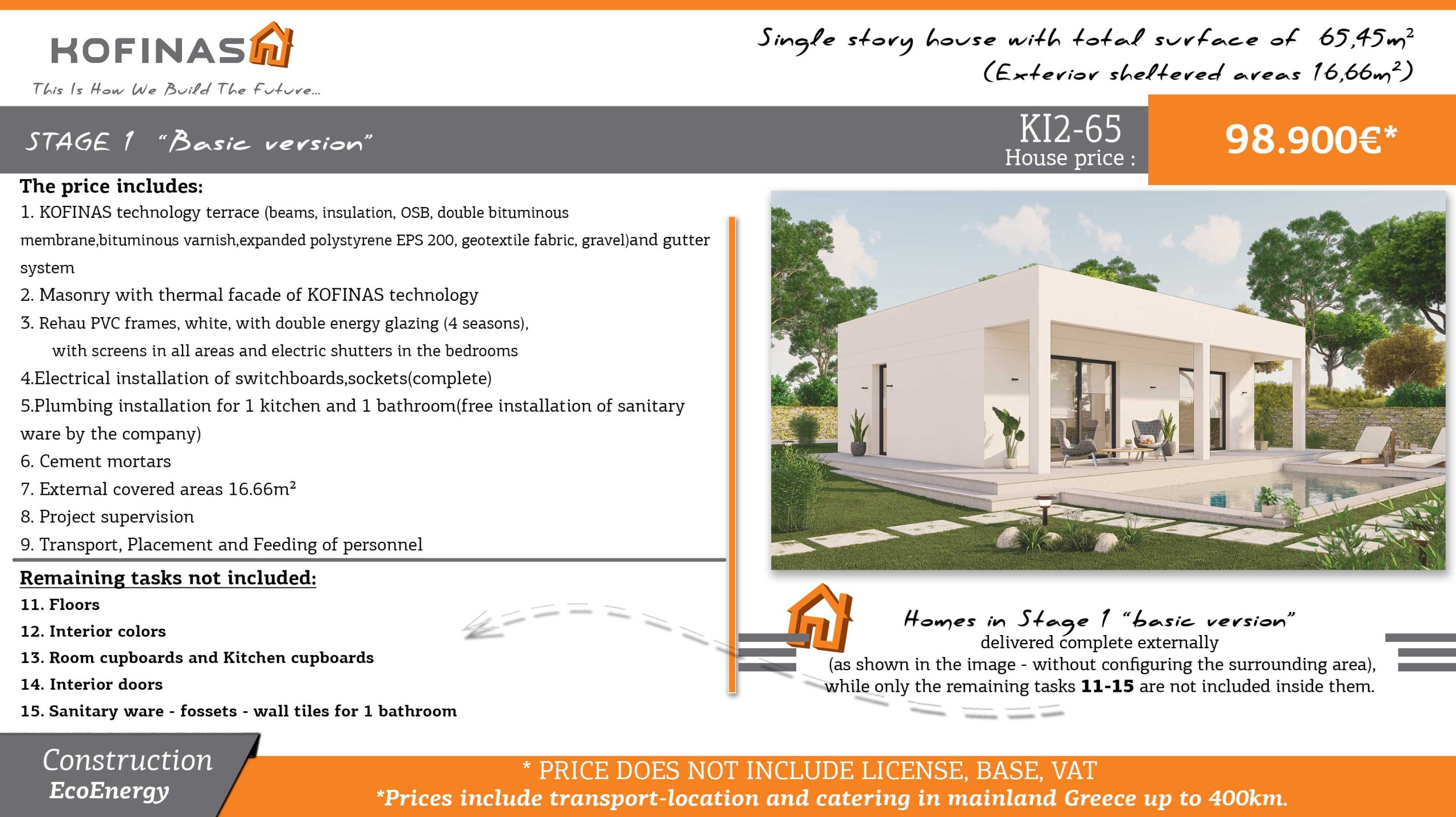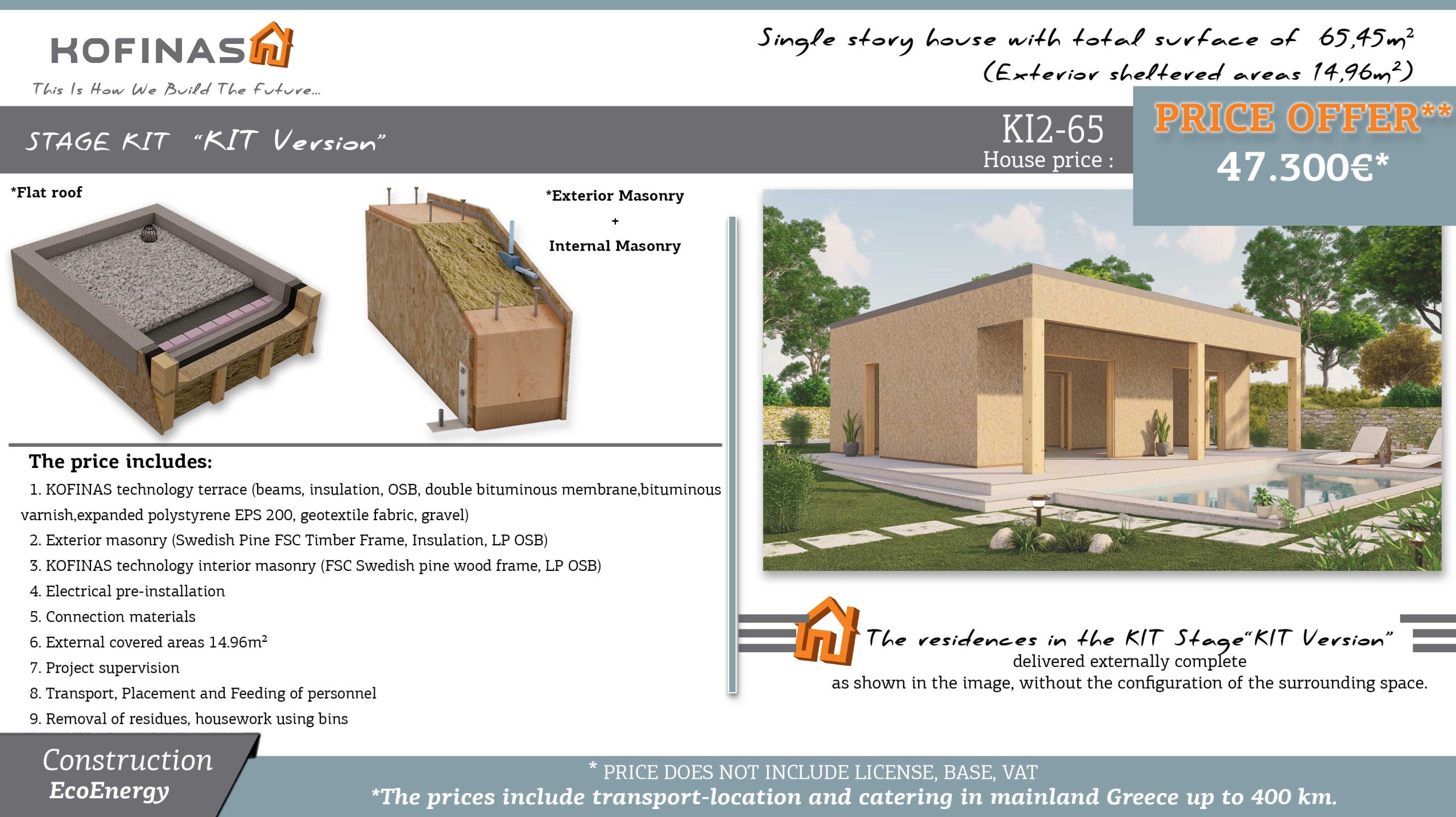 The company KOFINAS SA presents you with a proposal for a ground floor residence of 65.45 m² (Ground Floor Residence KI2-65) for the home of your dreams. The Kofinas company innovates without resting. It continuously introduces new elements in the construction of houses. Which are recognized and “are certified". Both from our hundreds of satisfied customers and from the National Technical University of Athens, where the unique building system of the Kofinas company was tested for its durability surpassing any natural limit of endurance.