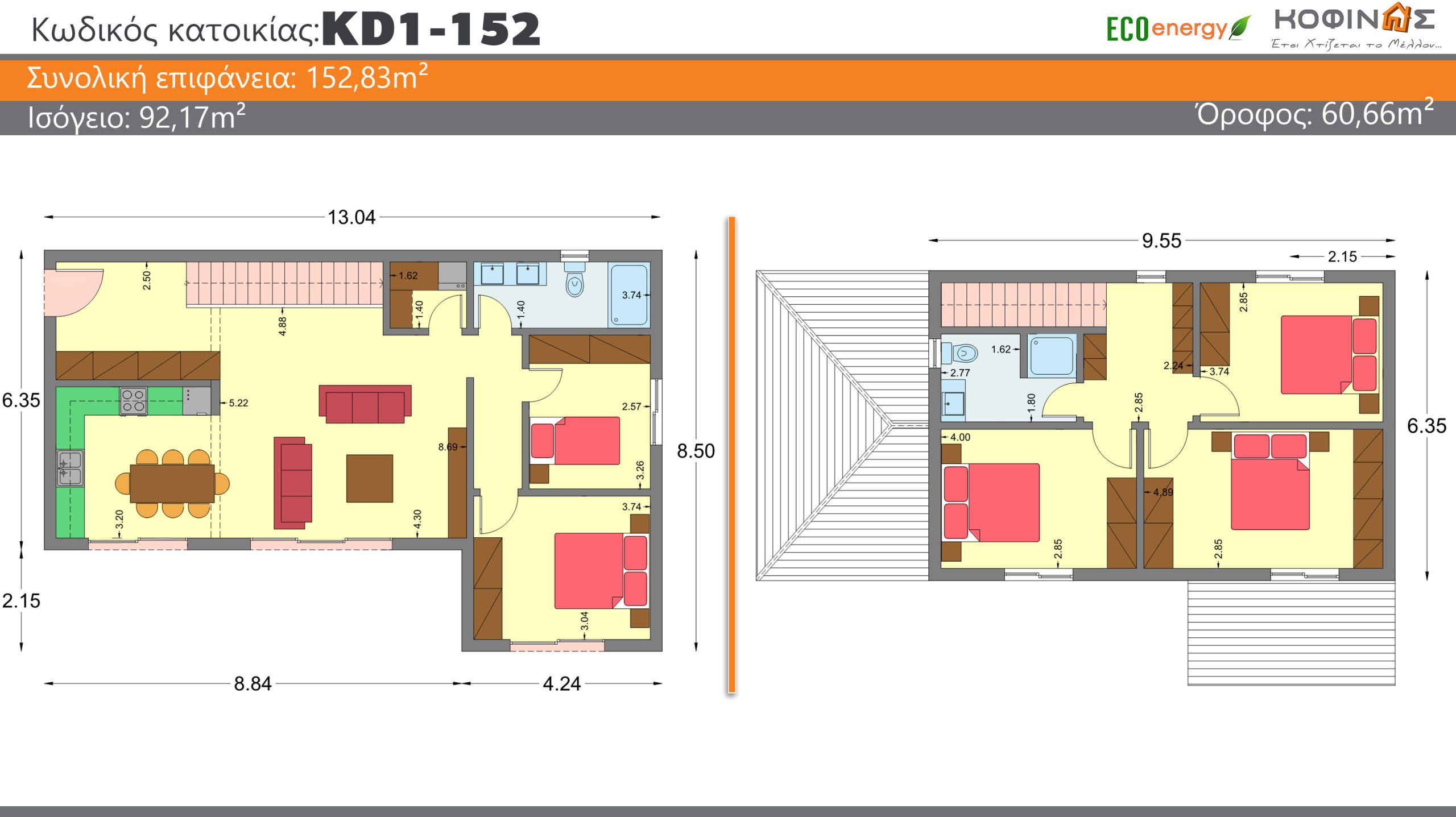 Η ΚΟΦΙΝΑΣ Α.Ε. παρουσιάζει το νέο ενδεικτικό κοστολογημένο σχέδιο Διώροφης Κατοικίας ΚD1-152 (152,83 τ.μ.), μία ολοκληρωμένη πρόταση υψηλής αισθητικής και λειτουργικότητας, που συνδυάζει την καινοτομία με την οικολογική συνείδηση. Σχεδιασμένη για να καλύψει κάθε ανάγκη της σύγχρονης οικογένειας, η κατοικία ΚD2-152 αντανακλά τις αξίες της εταιρείας: ποιότητα, βιωσιμότητα και εγγύηση στον χρόνο.