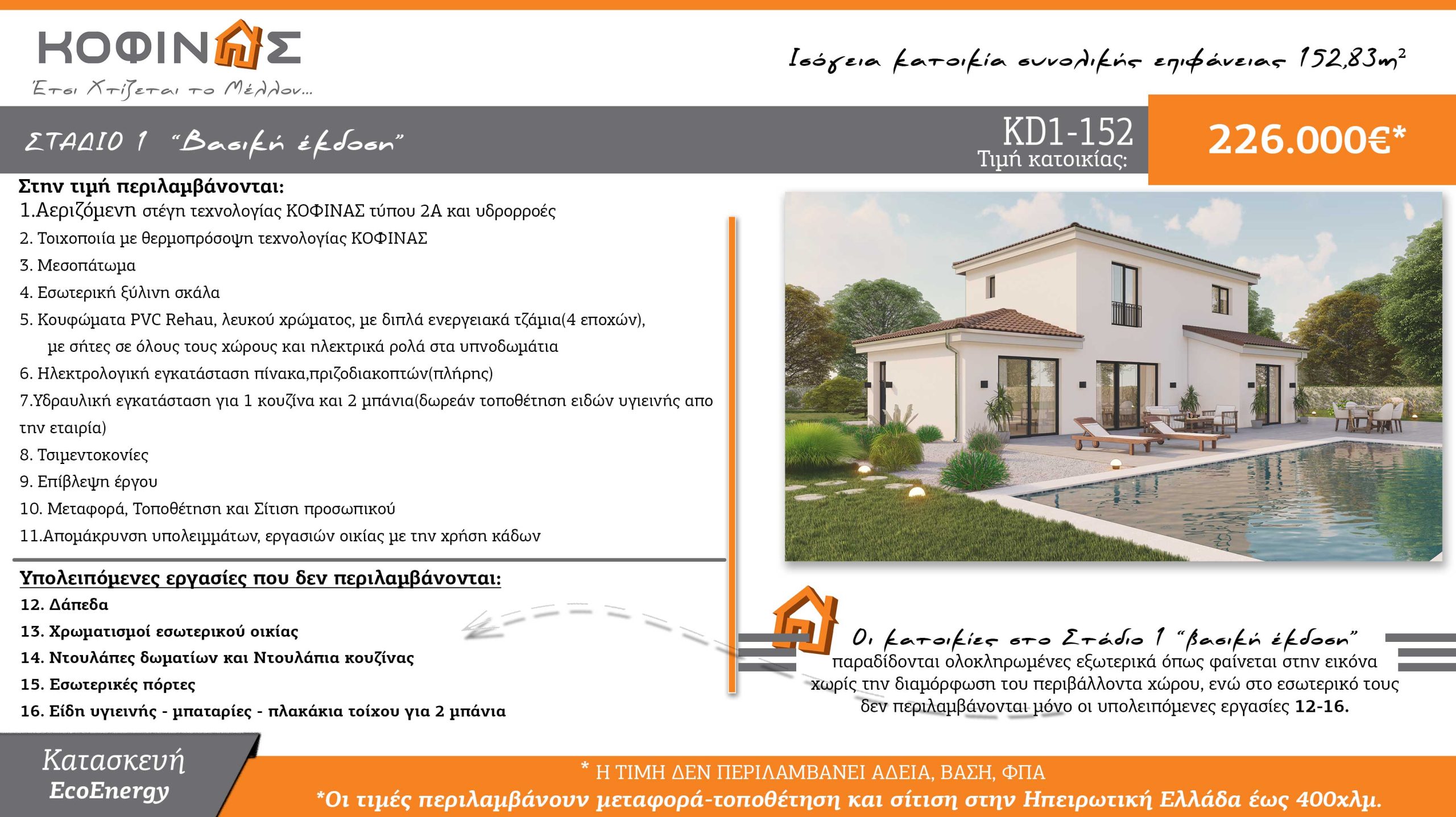 Οι κατοικίες στο Στάδιο 1 “βασική έκδοση” παραδίδονται ολοκληρωμένες εξωτερικά(όπως φαίνεται στην εικόνα- χωρίς την διαμόρφωση του περιβάλλοντα χώρου),ενώ στο εσωτερικό τους δεν περιλαμβάνονται μόνο οι υπολειπόμενες εργασίες 12-16.