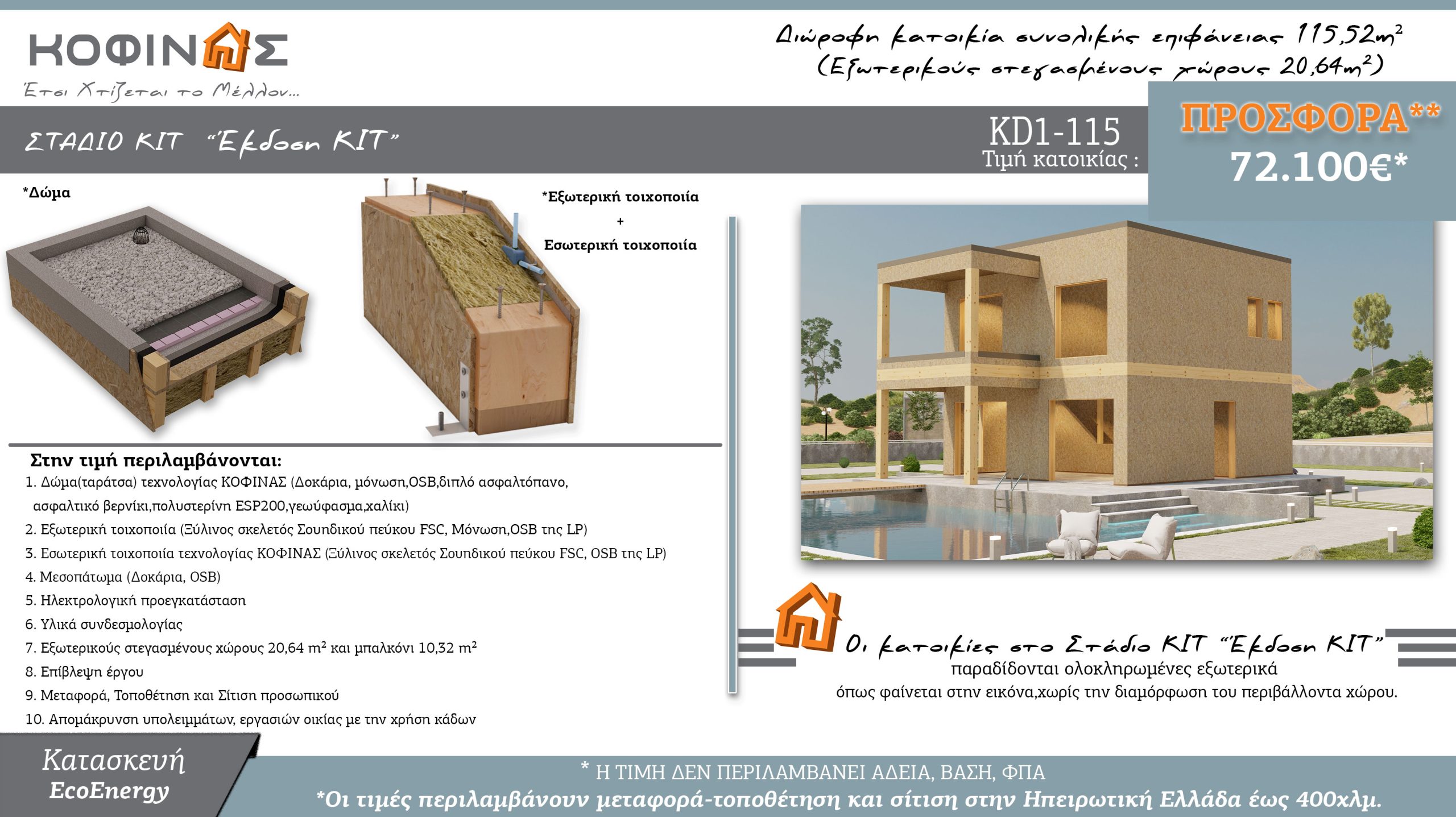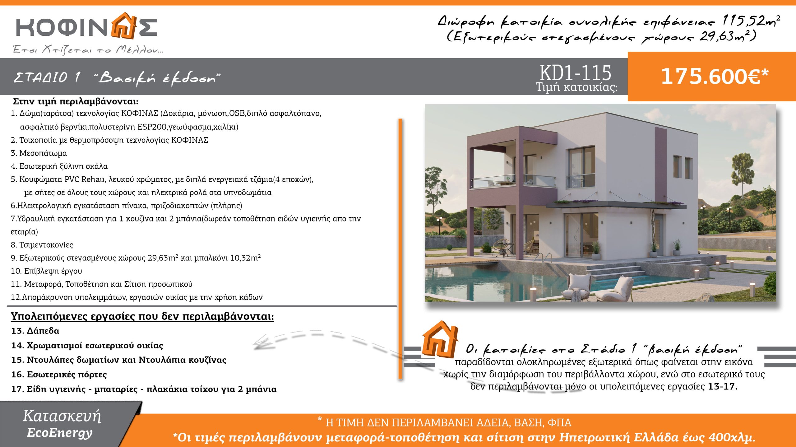 Η ΚΟΦΙΝΑΣ Α.Ε. παρουσιάζει το νέο ενδεικτικό κοστολογημένο σχέδιο Διώροφης Κατοικίας ΚD1-115 (115,52 τ.μ.), μία ολοκληρωμένη πρόταση υψηλής αισθητικής και λειτουργικότητας, που συνδυάζει την καινοτομία με την οικολογική συνείδηση. Σχεδιασμένη για να καλύψει κάθε ανάγκη της σύγχρονης οικογένειας, η κατοικία ΚD1-115 αντανακλά τις αξίες της εταιρείας: ποιότητα, βιωσιμότητα και εγγύηση στον χρόνο.