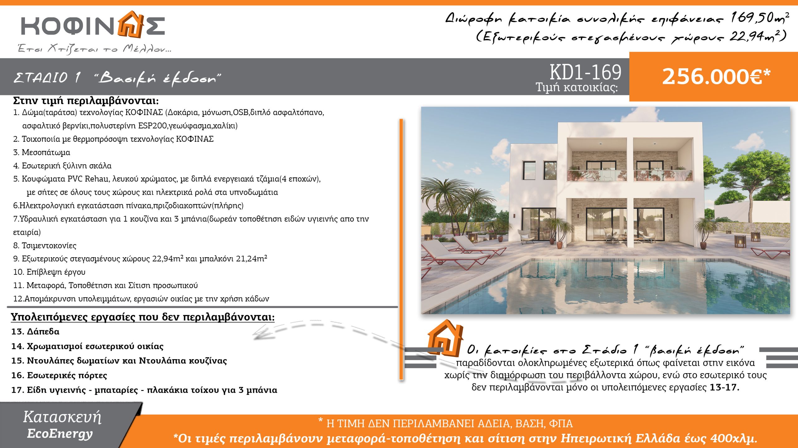 Η ΚΟΦΙΝΑΣ Α.Ε. παρουσιάζει το νέο ενδεικτικό κοστολογημένο σχέδιο Διώροφης Κατοικίας ΚD1-169 (169,50 τ.μ.), μία ολοκληρωμένη πρόταση υψηλής αισθητικής και λειτουργικότητας, που συνδυάζει την καινοτομία με την οικολογική συνείδηση. Σχεδιασμένη για να καλύψει κάθε ανάγκη της σύγχρονης οικογένειας, η κατοικία ΚD1-169 αντανακλά τις αξίες της εταιρείας: ποιότητα, βιωσιμότητα και εγγύηση στον χρόνο.